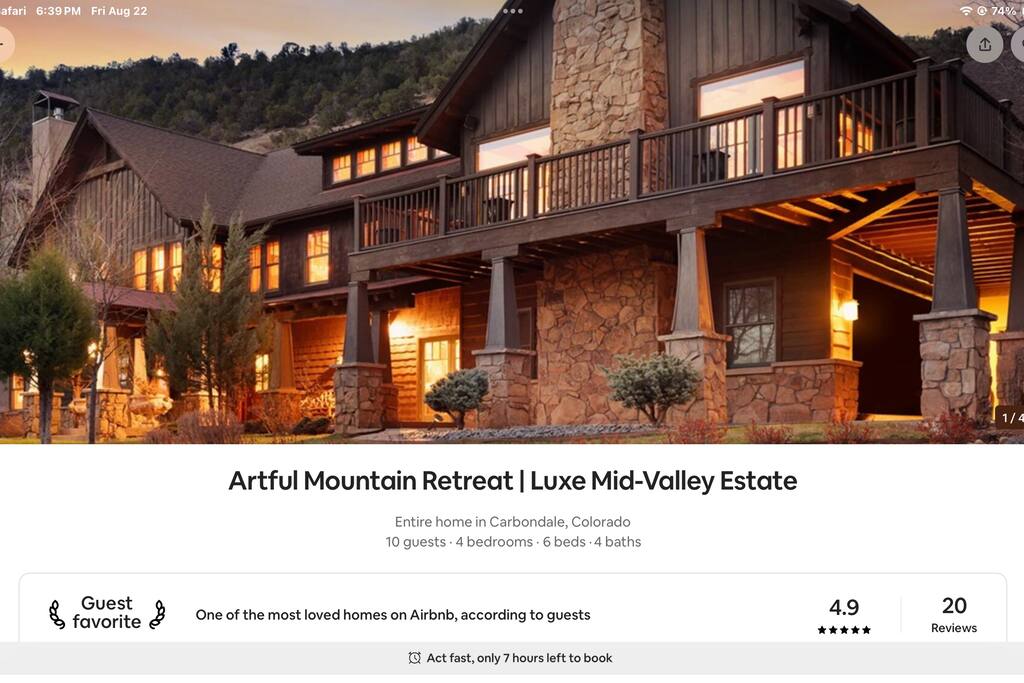 RARE 5 BRs, 4 King Beds and 2 Queens! New 8 person Hot Tub! Located on 5.5 secluded acres, your art-filled mountain estate is located near Aspen and Snowmass. This 5500 square foot home is beautifully appointed; offering ultimate privacy, a backyard oasis, high-end amenities and elegant interiors filled with original art. Designed for families, groups, and Luxe travelers, the home features a chef's kitchen, spacious living areas with soaring ceilings, a spa-like master bath and 3 new decks.